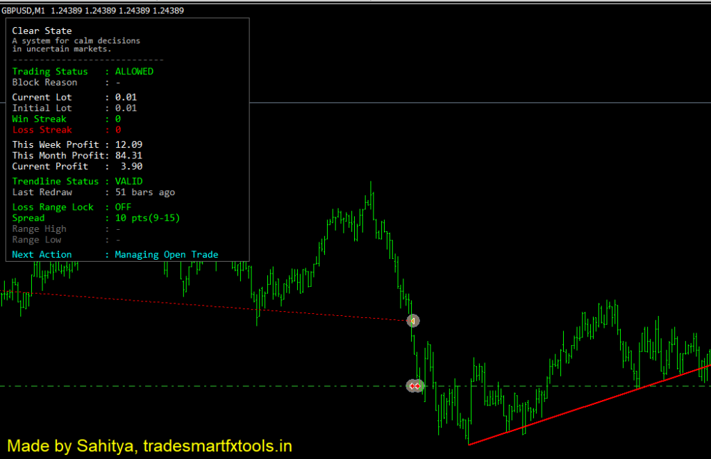 ClearState shows detailed live statistics so you always know what’s happening. You can track weekly and monthly profits, current running profit, lot size, open trades, trading status, drawdown, and execution details — all in one clear view.