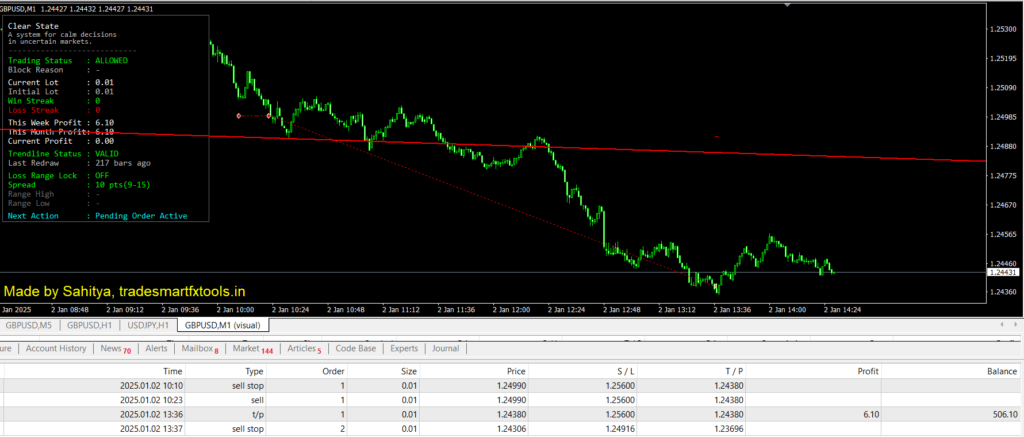 Instead of instant market entries, ClearState uses pending orders. This helps avoid fake breakouts and impulsive entries by allowing price to confirm direction before a trade is triggered.