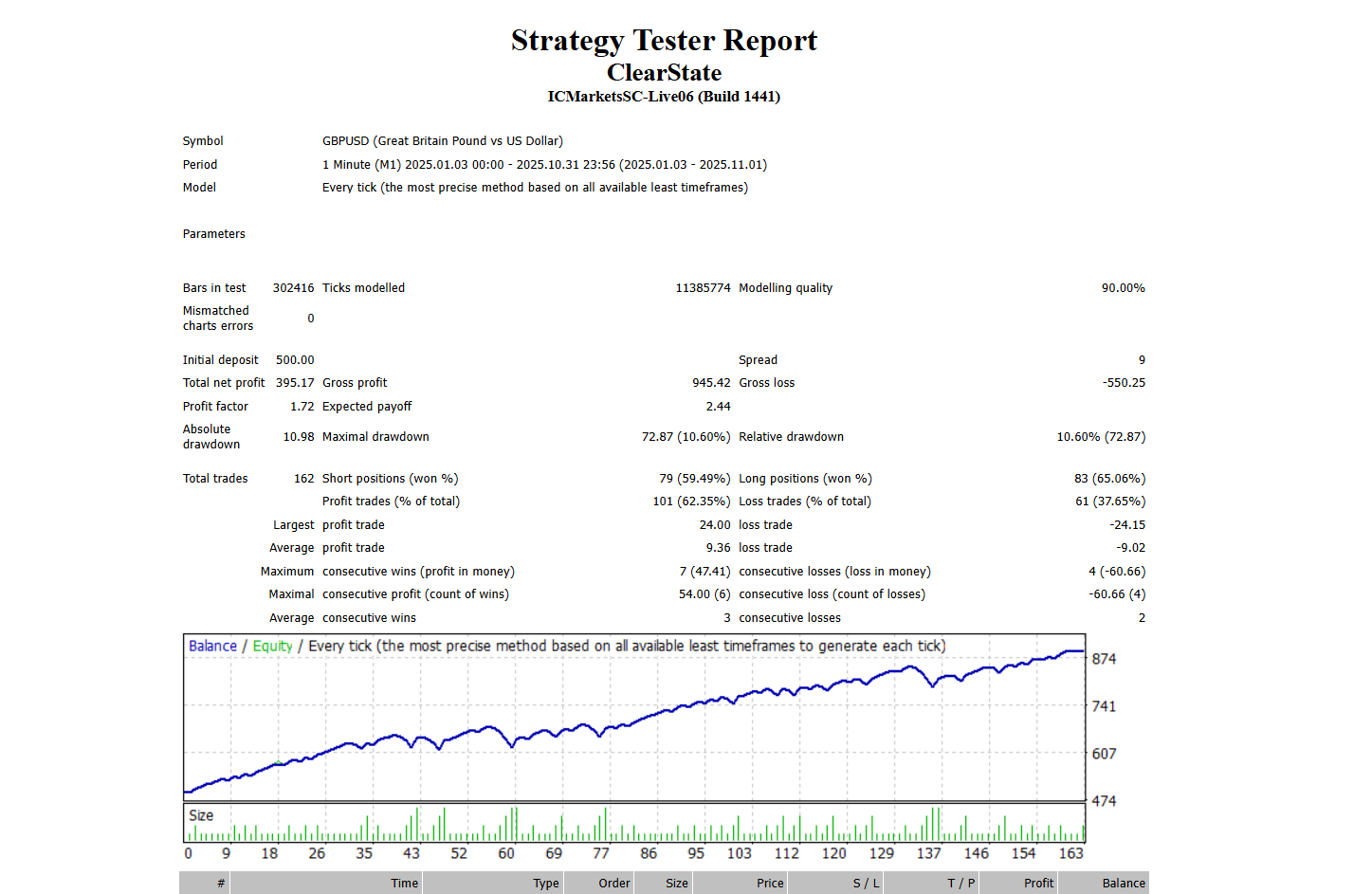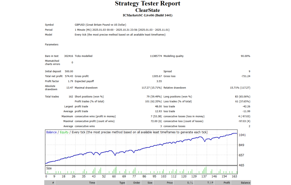 Trading in financial markets involves risk, and losses can occur. ClearState is a rule-based trading automation designed to assist with execution and risk control, not to guarantee profits or eliminate losses. All results shown on this page, including backtests and examples, are based on historical data and are provided for educational and informational purposes only. Past performance does not guarantee future results. Live trading outcomes may vary due to market conditions, spreads, slippage, broker execution, and individual risk settings. ClearState does not provide financial, investment, or trading advice. You are fully responsible for how the system is used, the risk parameters you choose, and any trading decisions made on your account. Only trade with capital you can afford to lose. By using ClearState, you acknowledge and accept these risks and understand that trading requires discipline, patience, and responsible risk management.